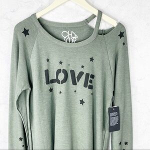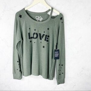 Chaser Love Stars Cozy Knit Vented Pullover Sweatshirt Shirt. Crew Neck. Long Sleeves. Fitted Cuffs. Knit Construction. Distressed Cut Out Details. Safari Olive Military Army Green Color. Love Star Details. NWT / New with Tags. Great Condition. No Stains or Rips.