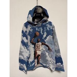 Design: Woven sky and clouds scene with basketball player wearing BULLS 23 on front; cloud pattern continues on back