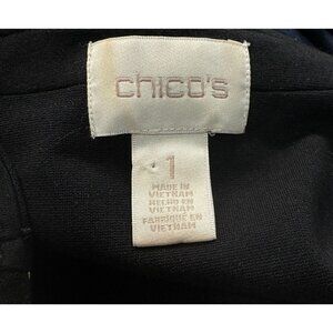 Some minor stains, as shown. Sleeve cuffs are very slightly dirty. Otherwise good condition. Wirh zippered pockets! Solid Black panels at sides create a slimming effect. Open front. Chico's size 1 which is equal to a regular women's medium/8 (Chico's size chart attached). No inner fabric content label but this is 70% polyester/15% cotton/14% rayon/1% spandex. Machine wash. SUPER RARE and IMPOSSIBLE to find ANYWHERE! Lovely!