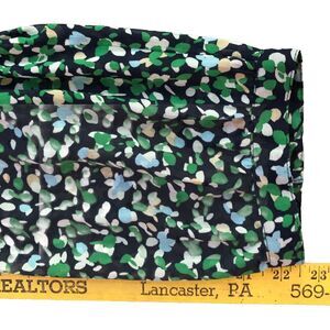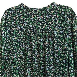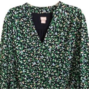 Chicos Abstract Dot Print Split Neck Blouse in Navy, Light Blue & Kelly Green. Semi Sheer Popover Tunic Top with Slip Lining & Sheer 3/4 Baloon Sleeves. Easy Care, Machine washable.