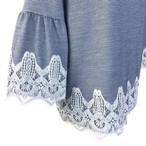 Bon jour, lovely! Styled with French stripes and wide 3/4 sleeves, this must-have, scoop-neck top is finished with a flourish of gorgeous lace.
