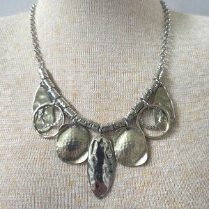 Muted gold & silver tone metal discs with hammered silver beads in between.