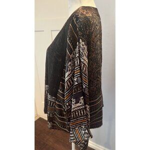 Open front 78% Silk, silk blend open front kimono sleeve jacket from Chico's. Womens size 2 (L), loose fit. Bohemian Aztec print, black, rust orange, black and cream. 22" length, 23.5" armpit to armpit. Excellent condition!