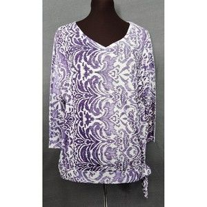 Chicos Top Abstract Ikat Purple Tunic Blouse Shirt Chico Sz 2 Large Tie Front. 100% Polyester. Made in the USA. Great used condition, no stains or holes. Smoke-free home. Check out my other items. I will combine shipping