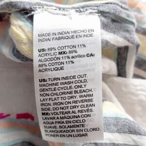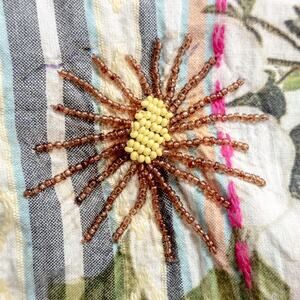 Chico’s long sleeve blouse with vertical pastel stripes and garden floral embroidery layered with beaded insect accents. Women’s size 2 (Chico’s sizing, equivalent to a large). Light and breathable cotton blend with button front, pointed collar, and gentle structure throughout. Beaded bees and dragonflies add handmade charm without feeling costume-y. The back features textured striping and delicate pink running stitch detail that adds to the soft-artisan vibe.