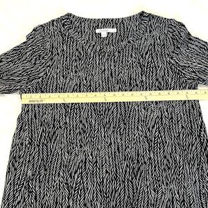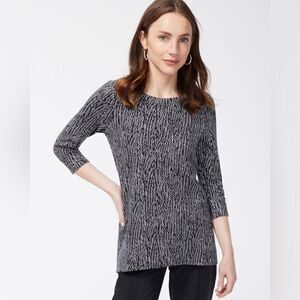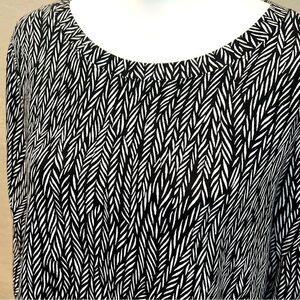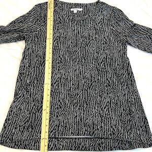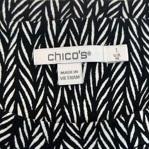 Chicos Zenergy top, black white tunic, french terry knit, three quarter sleeve, comfy casual top, travel friendly, athleisure tunic, stretchy pullover, women’s size 1 medium, everyday basics, neutral print top, machine washable, work to weekend, lounge friendly top, soft knit tunic
