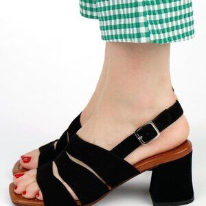 Chic black suede heels with strappy design. Features a silver buckle. Ideal for stylish outings.