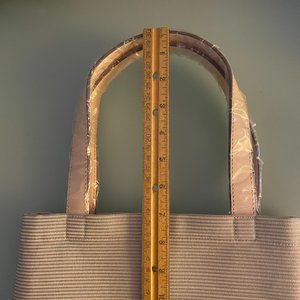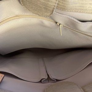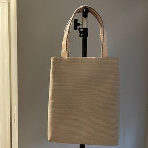 Chinese Silk Tapestry Small Tote, from Suzhou Museum, "K'o-ssu" technique ("cut silk") uses short lengths of weft thread tucked into the textile (only weft threads are visible in finished fabric), cream color with pink flowers and tan leather handles, fabric lining with one zipped pocket and two open pockets, magnetic closure on top, NWOT, Pristine, in original box
