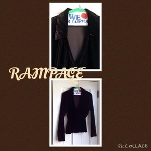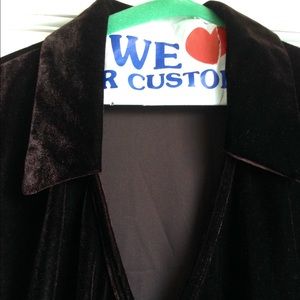 This top has a deep v-neck and fitted waist. It's chocolate brown velour. Size medium, but I would say it runs small. Shoulder to shoulder it measures 17.5 inches, waist measures 15 inches (laid flat). Lovely fitted waist flows into a slight peplum. REASONABLE OFFERS CONSIDERED. This is a polyester/spandex top, dry clean only.