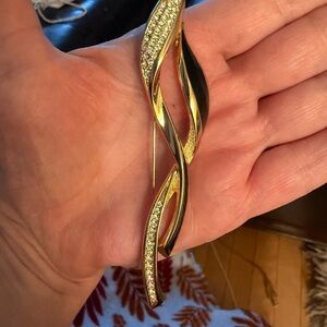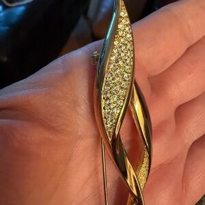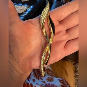 Elegant and sculptural, this Christian Dior brooch features a sweeping, fluid design in gold-tone metal with rich black enamel and sparkling rhinestone accents. It’s a striking, timeless accessory—perfect for adding a touch of designer flair to jackets, scarves, or hats.