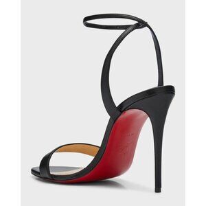 • Black Color/Leather/4" Covered Stiletto Heel/Adjustable Ankle Strap/Signature Red Soles/Includes Dust Bag, Replacement Heel Caps & Box