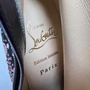 Style Details: Black suede upper with multicolor graphic crystal embellishments, pointed toe, inner side zip, classic red lacquered sole, and 4.25-inch stiletto heel.