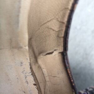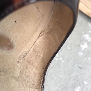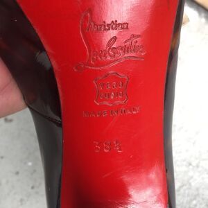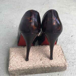 Please look at the pictures. These are distressed. Tortoiseshell finished Patent leather. Back of the inside heels could be sanded and painted, Nonskid soles have been put on them.. Again, please look at the pictures. Heel height is 4 inches platform height is .5”