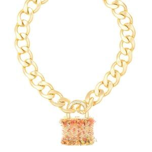 Chunky curb chain short necklace featuring a fabric embellished lock.