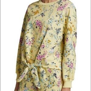 The Cinq à Sept Women's Parker Sakura 2 Piece Set in Yellow Floral Giles features a round neckline, long sleeves, and a regular fit. Made of cotton material, this outfit includes a sweatshirt and tapered-leg pants with a 27-inch inseam. Perfect for activewear or casual occasions, this set is designed for women in a size small and showcases a vibrant yellow multicolor floral pattern. A stylish and comfortable addition to any wardrobe, this outfit from the popular brand Cinq à Sept offers a fashionable and coordinated look for any woman.