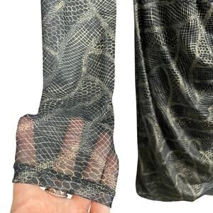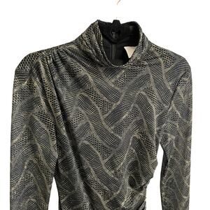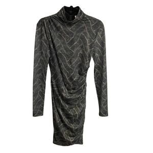 • Features: Zip up back with hook and eye closure, Lined bodice, Sheer long sleeves, Sheer mesh fabric overlay, Gathered / ruched sides, Mini length, Black & Toast / Black and beige abstract pattern, Marlene dress by Cinq à Sept