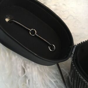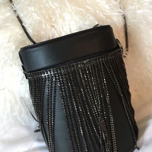 Circular, tubular shaped beautiful handbag with rhinestone fringe and a beautiful chain strap. Perfect for that night out on the town.