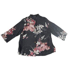Citron Santa Monica woman's gray Asian floral Foo Dog or Dragon button down the front silk blouse. Blouse has 3/4 sleeves and slits on both sleeves and hem. It's made of 100% silk and is a woman's size PM or Petite Medium.
