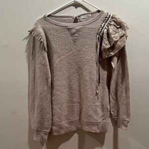 Stylish beige sweater featuring unique lace and ribbon detail on the shoulder. Perfect for a chic look. no size tag but fit like small/medium. 18” ptp, 25” length