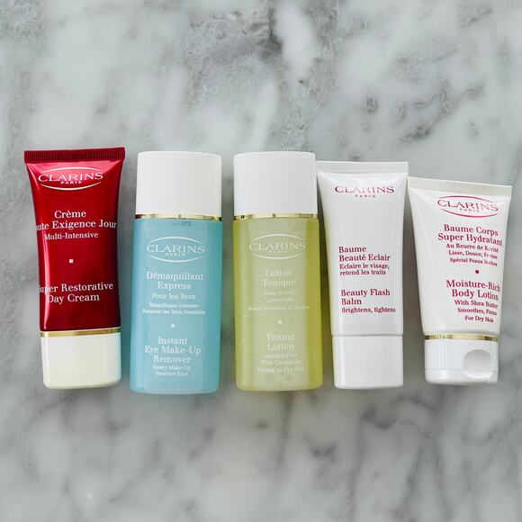 Clarins 5pc Set Travel Toner Day Cream Make-up Remover Body Lotion Beauty Flash