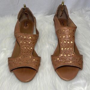 Clarks Artisan Tan Leather Woven Gold Back Zip Wedge Sandals Sz 11
