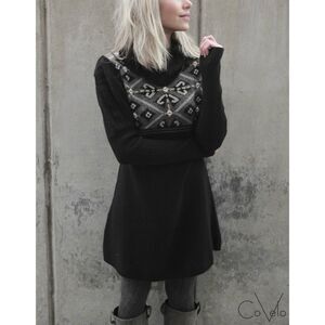 Cozy lambswool and angora tunic dress with softly hued Inuit graphics across chest and a unique drop-stitch pattern defining the cowl neck and upper sleeves. Back is solid gray and black. A-line shape. Slight puff shoulder.