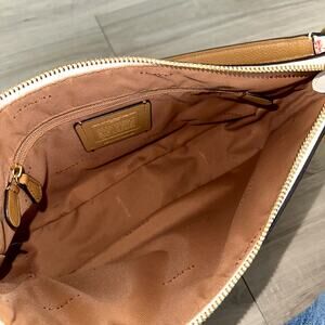 Coach Chelsea shoulder bag in floral bow print in the color Brass/Chalk, features polished pebble leather, inside zip pocket, zip-top closure, and fabric lining. In excellent pre-owned condition with light signs of wear, interior also in excellent condition.