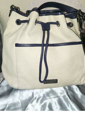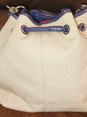 Genuine Coach bucket style bag. Exterior is cream canvas with purple leather trim/handles/tassel with magnetic close pocket and cinch style closure.