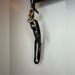 This Coach wallet wristlet is crafted from black textured leather with a gold Poppy design, featuring a zip-around closure for security. The accordion style wallet is designed with multiple credit card slots and an organizer section to keep your essentials neatly stored. The sleek and stylish accessory is perfect for the modern woman looking for a functional and fashionable piece to carry her belongings.