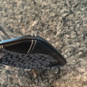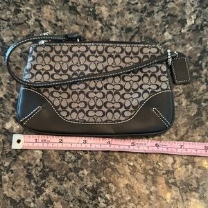 This Coach clutch showcases a sophisticated black and gray design, perfect for adding a touch of elegance to your ensemble. Crafted with the iconic Coach quality, it offers a compact and stylish solution for carrying your essentials. The wristlet feature ensures convenience and versatility for any occasion.