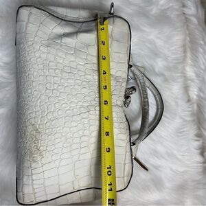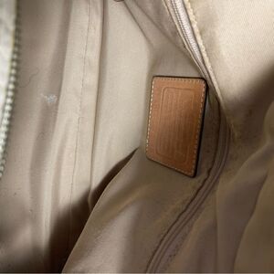 Coach Bleeker beige Croc Embossed Satchel Handbag 30449 front zipper pocket top zipper the inside lining has a side zipper two side pockets pre owned in fair use condition the front zipper pocket is not closing and the shoulder strap is missing no tear signs of wear on the handle straps see all pictures any questions please message.