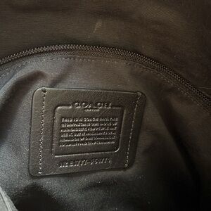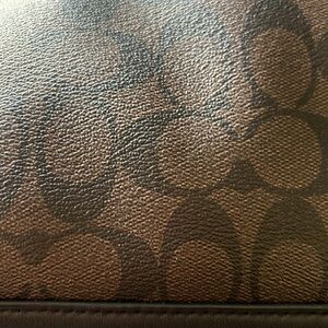 Signature coated canvas, inside zip and with multi function pockets, zip closures, fabric lining, and open pockets. Detachable wide strap. Great bag for work, or social. In great pre-owned condition