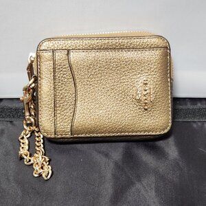 Coach ZipCardCase C8357 in Gold pebble leather.  Exterior has two credit card slots and one slip pocket in front; one view pocket for ID on back.  Gold toned chain with clip.  3" x 4.5" x 3/4"