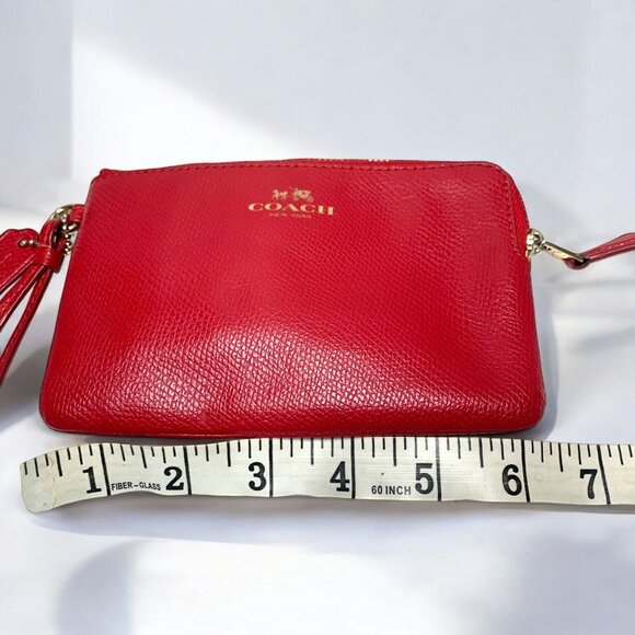 Coach Corner Zip Wristlet in True Red pebbled leather.This small wristlet is compact yet functional, with space for your keys, cards and even an iPhone (up to a 15 Pro Max). This small corner zip wristlet features a wrist strap for ease and a zip-top closure to secure your items. To keep your cards handy on the go, organize them in the convenient built-in slots.