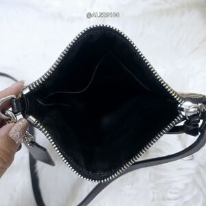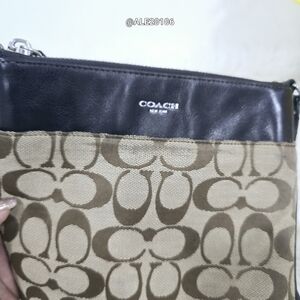 Coach Stylish crossbody with signature pattern. Sleek brown and tan design. Perfect for everyday use.