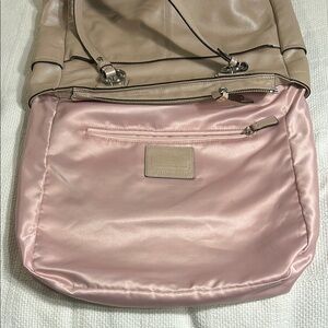 This buttery soft Coach purse has a slip pocket on the back of the purse and a pocket on each end of the purse. The main compartment is secured by a zipper closure, and inside the purse you will find 2 slip pockets on the front wall of the purse and a zippered pocket on the back wall. The interior lining has been cleaned and only a few minor spots remain. The lining in the back pocket of the purse is still stained as I was unable to pull it out for cleaning like I could the interior lining (shown in photos).