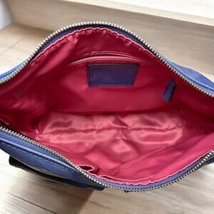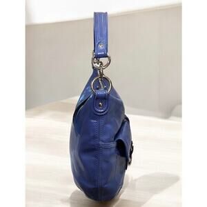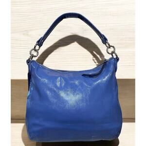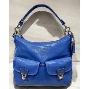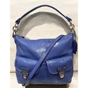 This Coach F23401 Daisy Liquid Gloss Pocket Hob Bag from 2012 is such a great Coach style and color! Featuring glossy patent leather in the Periwinkle colorway with silver hardware, this hobo bag is both super stylish and functional with a removable long strap and front exterior pockets. This hobo is just as stylish today as it was over 10 years ago and if you love the Y2K, Coach preppy glam look, this is a must have for your collection!