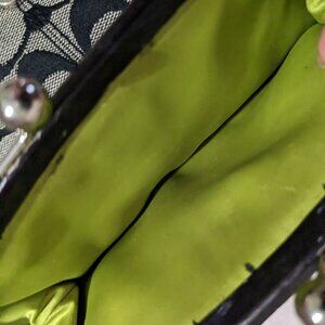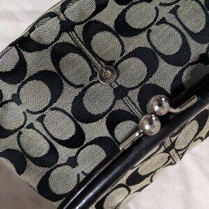 Coach fold over signature wristlet, gray & black, kiss lock clasp closure and a magnetic closure, length 4 3/4", width 8", 4 14" deep, very good condition
