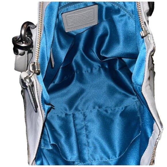 The Coach Grey Leather Kristin Spectator Hobo Handbag Purse is a stylish and versatile accessory for women. Made of luxurious leather with a satin lining, this medium-sized shoulder bag features a trendy animal print top handle, adding a touch of sophistication to any casual outfit. With multiple pockets and a secure closure, this hobo bag is practical and chic, perfect for everyday use. Crafted by Coach, this handbag combines quality craftsmanship with a fashionable design, making it a must-have piece for any fashion-forward woman.