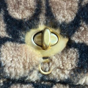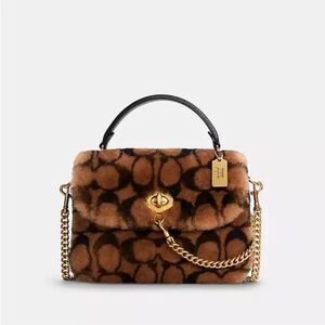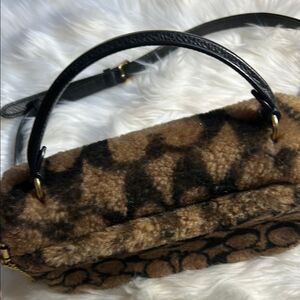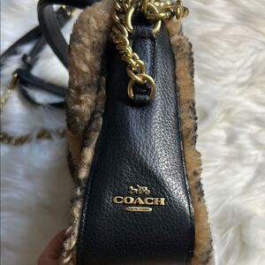 Coach X Jennifer Lopez Collab Marlie Bag. Stylish monogram shearling bag with gold chain accents. Perfect for adding a touch of luxury to any outfit. Preloved condition, some damage do the bottom portion with paint marks. As seen in photos. The rest of the bag is excellent.