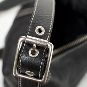 Shop this authentic vintage Coach Legacy Convertible Hobo Crossbody Bag in classic black glove-tanned leather, style number 9566. A rare and collectible piece from June 2005, this timeless Coach bag features nickel hardware, contrast stitching, and an adjustable leather strap with buckle accents—wear it as a chic crossbody or a stylish shoulder bag.