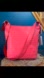 Made with slouchy soft watermelon pink glovetanned leather and nickel hardware, this duffel measures approximately 13” wide at the top, 10” wide at the bottom, 12” high, and 4 1/2” deep with 16” adjustable shoulder strap drop at the shortest adjustment. The zip top opens to access a very clean khaki cotton fabric lined interior with a zip pocket, two multi-function slip pockets and an outside zip pocket. If you look close at the perforations in the leather, you will see a Snow White color that matches the tassel.