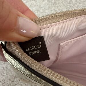 This Coach clutch showcases the iconic signature monogram in a sophisticated tan hue, complemented by a sleek metallic wrist strap. Its compact design makes it an ideal accessory for both casual outings and formal events, offering a touch of elegance to any ensemble.