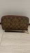 Elegant Coach wallet with iconic logo pattern in brown, tan, and gold. Features a secure zip closure and wrist strap.