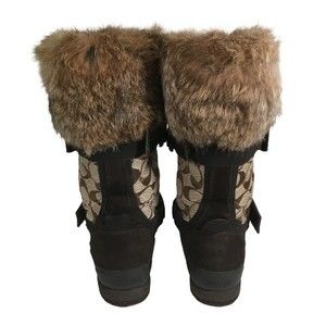 Coach Mariette Winter Snow Boot Size 6M A7185 Signature Canvas Suede with Fur Trim. Preowned. Good condition. No cuts, rips, holes, or stains. Has some wear on the fur trim. Comes with the box, original purchase receipt from Nordstrom for $264.74, and Coach card. Please see pictures. Check out our huge selection of thrifted treasures - bundle your purchases and save on combined shipping!