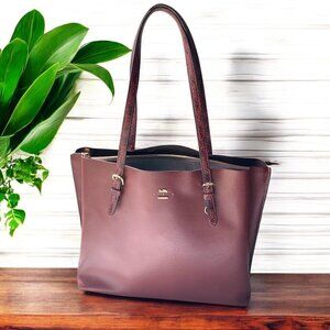Elegant and practical Coach leather Molly tote bag from 2022 in deep burgundy-red, pebble grain leather with snake embossed leather straps and gold hardware. Features include: Inside multifunction pocket, Zip-top closure, Side open compartments. Perfect for daily essentials and versatile styling. Fits slim laptop/ Ipad and the elegant color and design makes it easy to style with business casual and business formal clothing! Product Standouts: Comfortable, High Quality, Functional, Trending, Versatile.