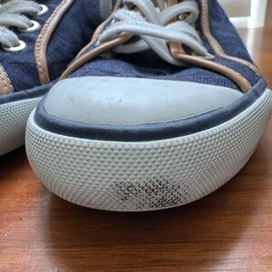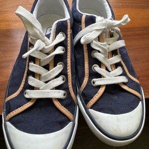 Stylish and comfortable Coach women’s sneakers in navy and tan. Perfect for everyday wear. Women’s sized 6. See images for details. I have not tried to clean them. Smoke free home.