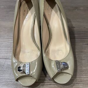 These are in pretty good condition. Some light spots in the interior of the shoes that may be cleanable. Soles have no significant wear and heels are in great shape. This are from the early 2000 poppy line. The buckle shows the poppy coach logo. Color is a light muted green color.