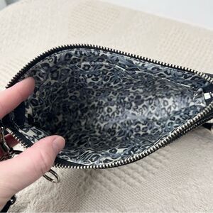 Black Poppy Patent Leather Swingpack Crossbody Bag by Coach. Style No. 42872 in Silver/Black. Iconic metallic silver poppy patch on the front. A timeless classic silhouette, this slim purse has Y2K and maximalist vibes. Perfect neutral designer bag for a woman the go. Front zip pocket. Top zipper closure. Ocelot printed interior features one slip pocket. Silver tone hardware. Measures 8.5"x5.5"x1.25". Adjustable strap with up to 24" drop, perfect for shoulder or crossbody wear. Good used condition with one tiny dent to the back. Please see all photos.