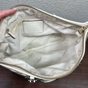 A stylish Coach satchel from the Prairie line crafted in signature jacquard with silver-tone hardware, leather trim and a fully lined fabric interior. This satchel features a zip-top closure, an interior zip pocket, interior slip pockets and an exterior zip pocket. It also features two leather handles with a 5" drop
